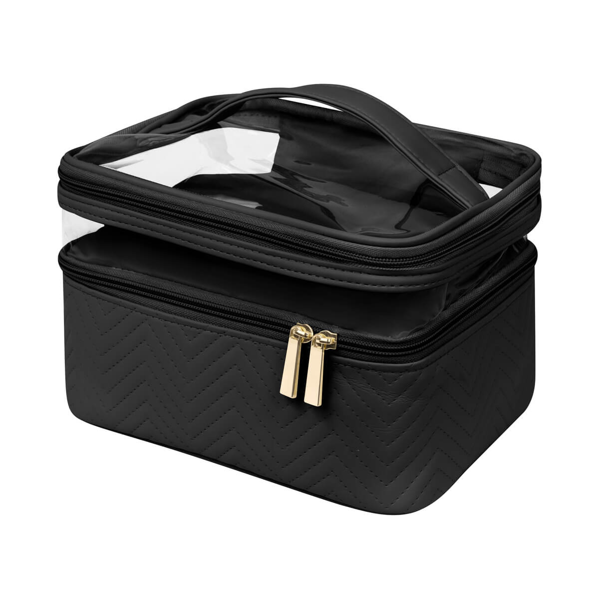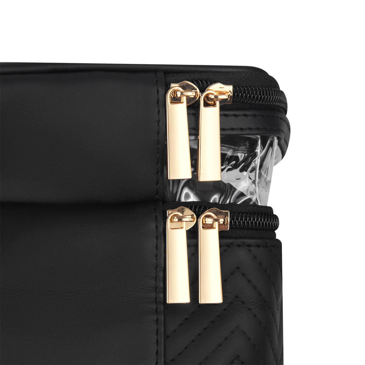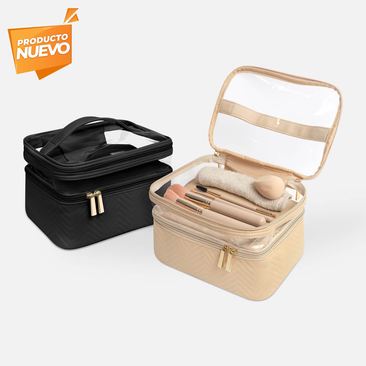 Descripción: Neceser fabricado en PU con cuerpo semirrígido. Cuenta con dos niveles con cierre, ideales para organizar y separar productos de belleza o higiene personal. Su panel superior de mica transparente permite visualizar el contenido fácilmente, mientras que el asa facilita su transporte. Ideal para guardar productos de belleza, cuidado personal o maquillaje.