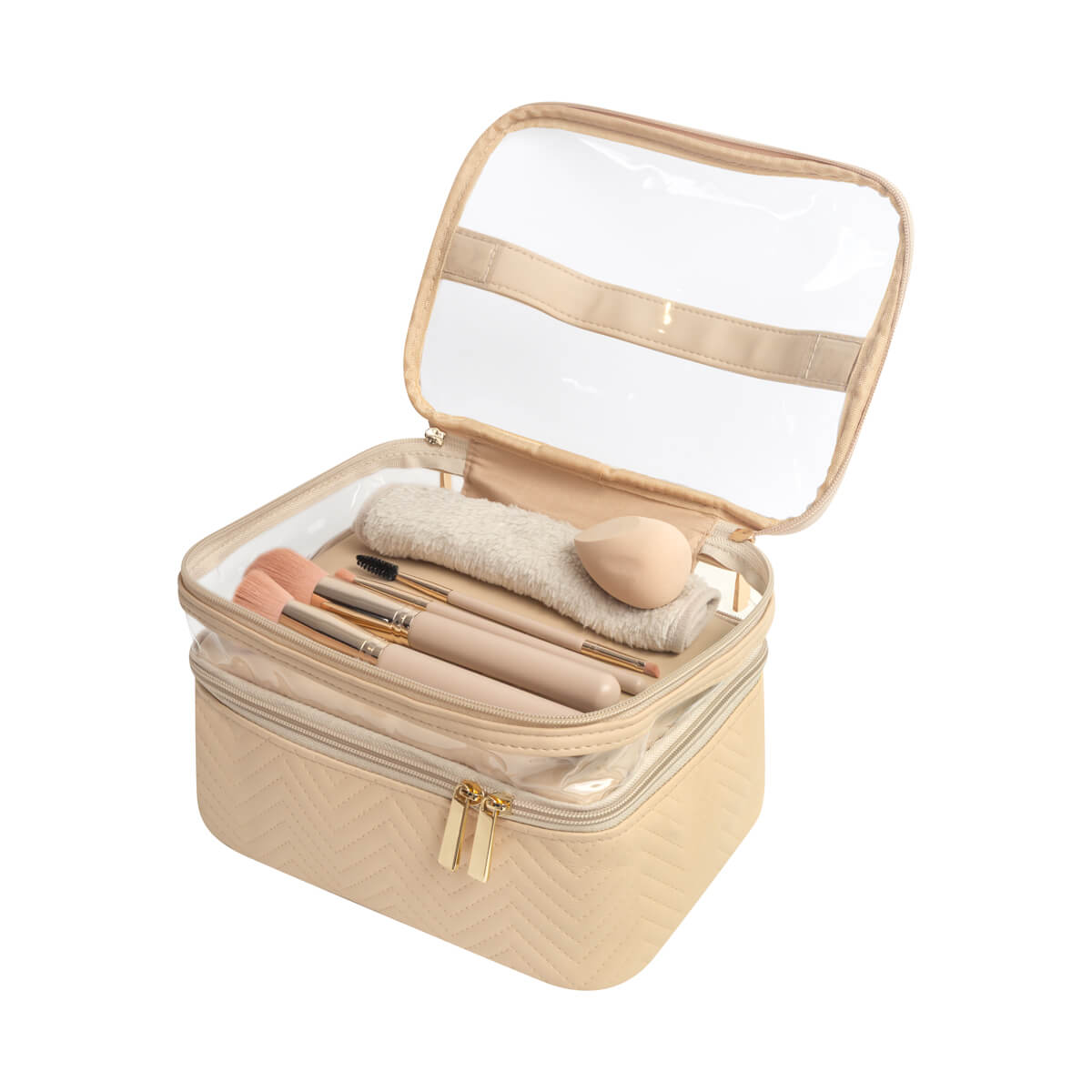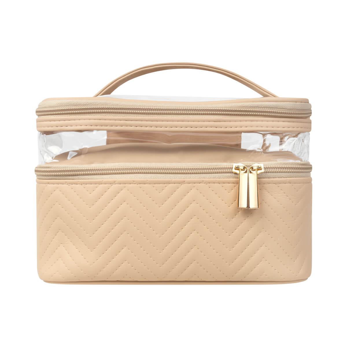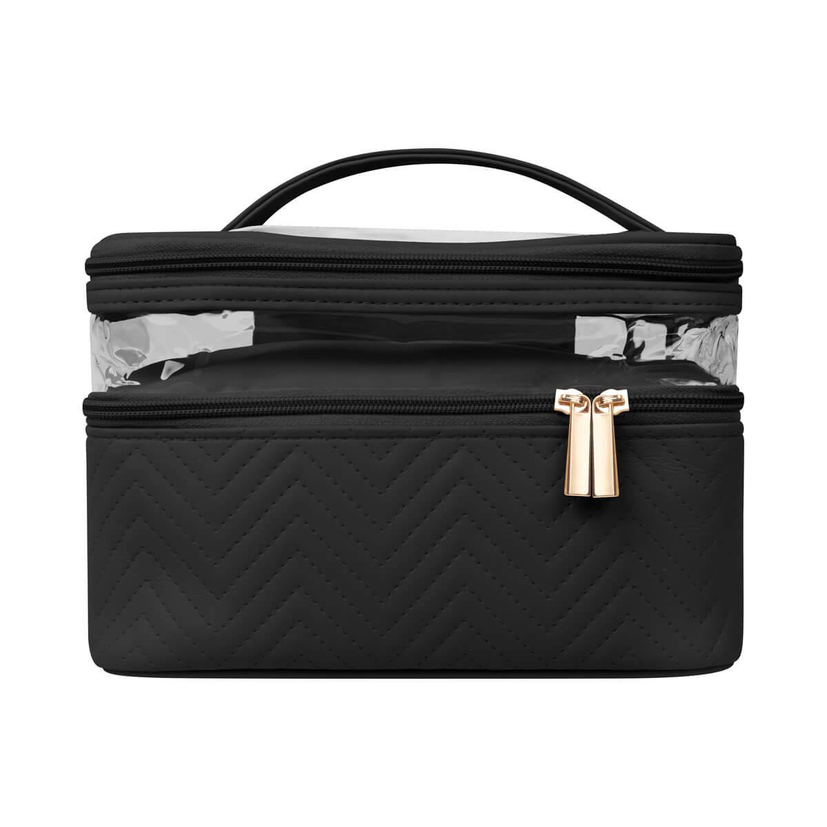 Descripción: Neceser fabricado en PU con cuerpo semirrígido. Cuenta con dos niveles con cierre, ideales para organizar y separar productos de belleza o higiene personal. Su panel superior de mica transparente permite visualizar el contenido fácilmente, mientras que el asa facilita su transporte. Ideal para guardar productos de belleza, cuidado personal o maquillaje.