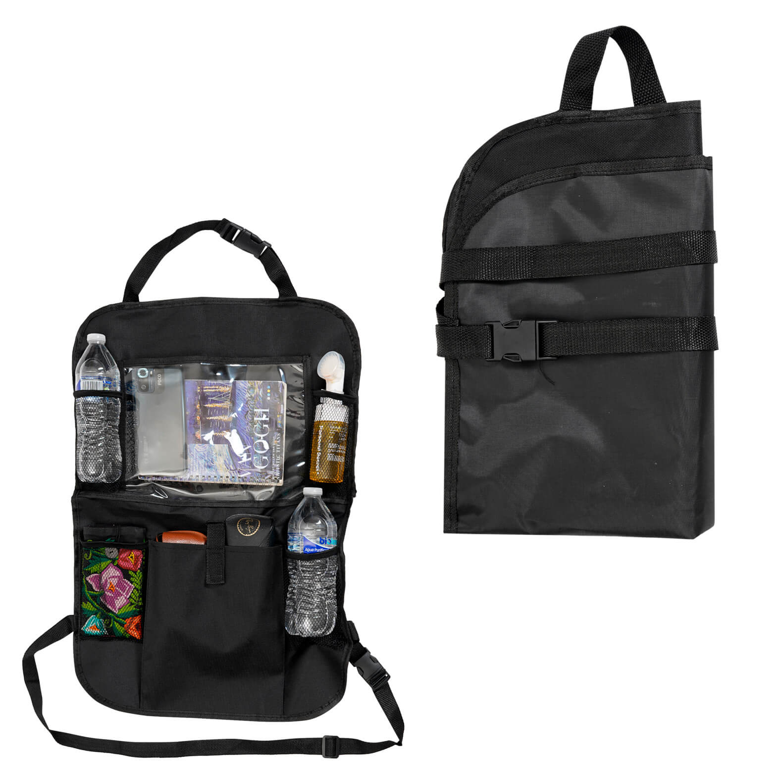 Descripción: Organizador para asiento de auto, con cuatro bolsillos de malla, un bolsillo con broche de velcro y un bolsillo transparente para tablet o celular. Cuenta con correas ajustables de broche.