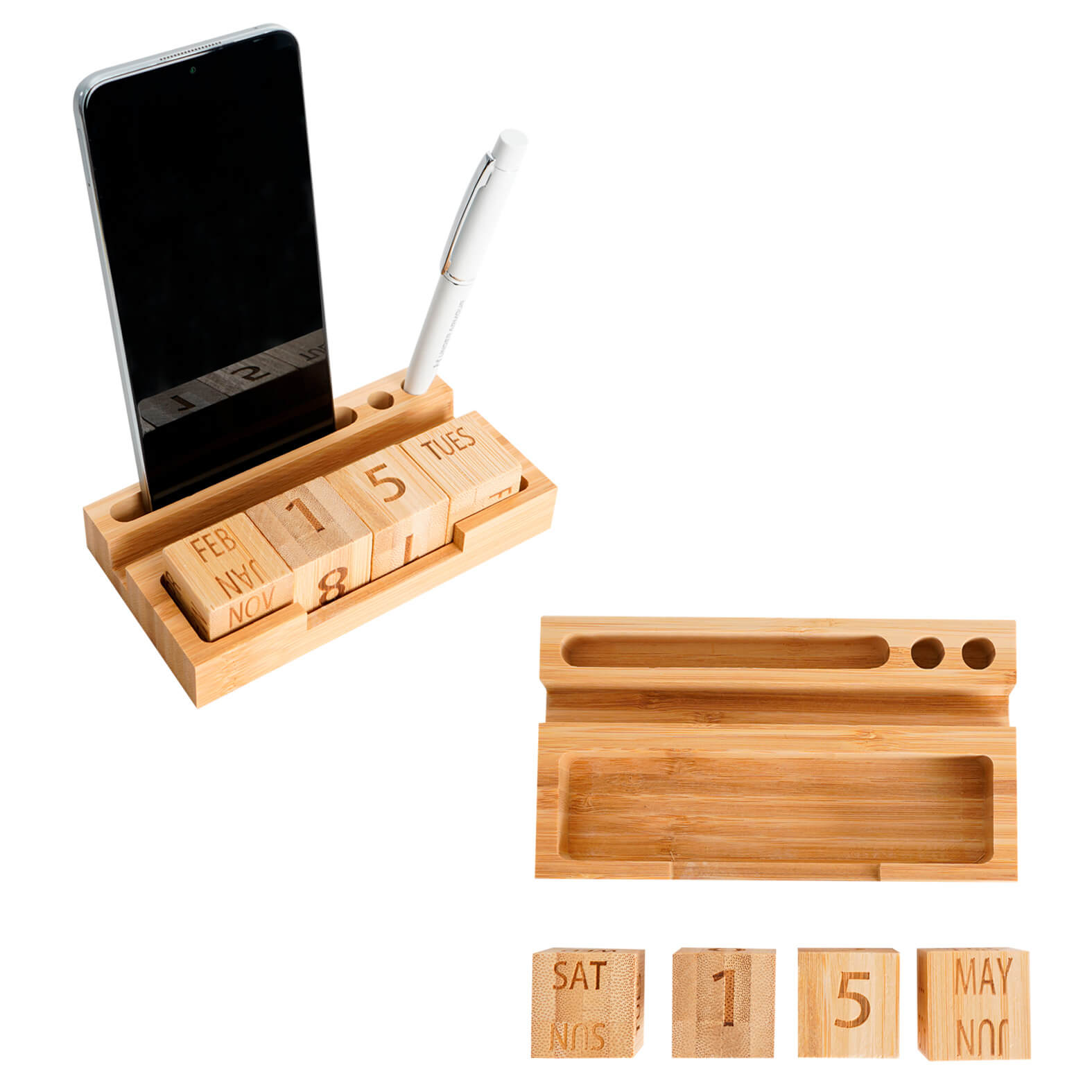 Descripción: Organizador de escritorio de bambú con calendario perpetuo, los cubos giratorios permiten ajustar el día, mes y fecha de manera manual. Además, cuenta con espacio para bolígrafos y funciona como soporte para celular.