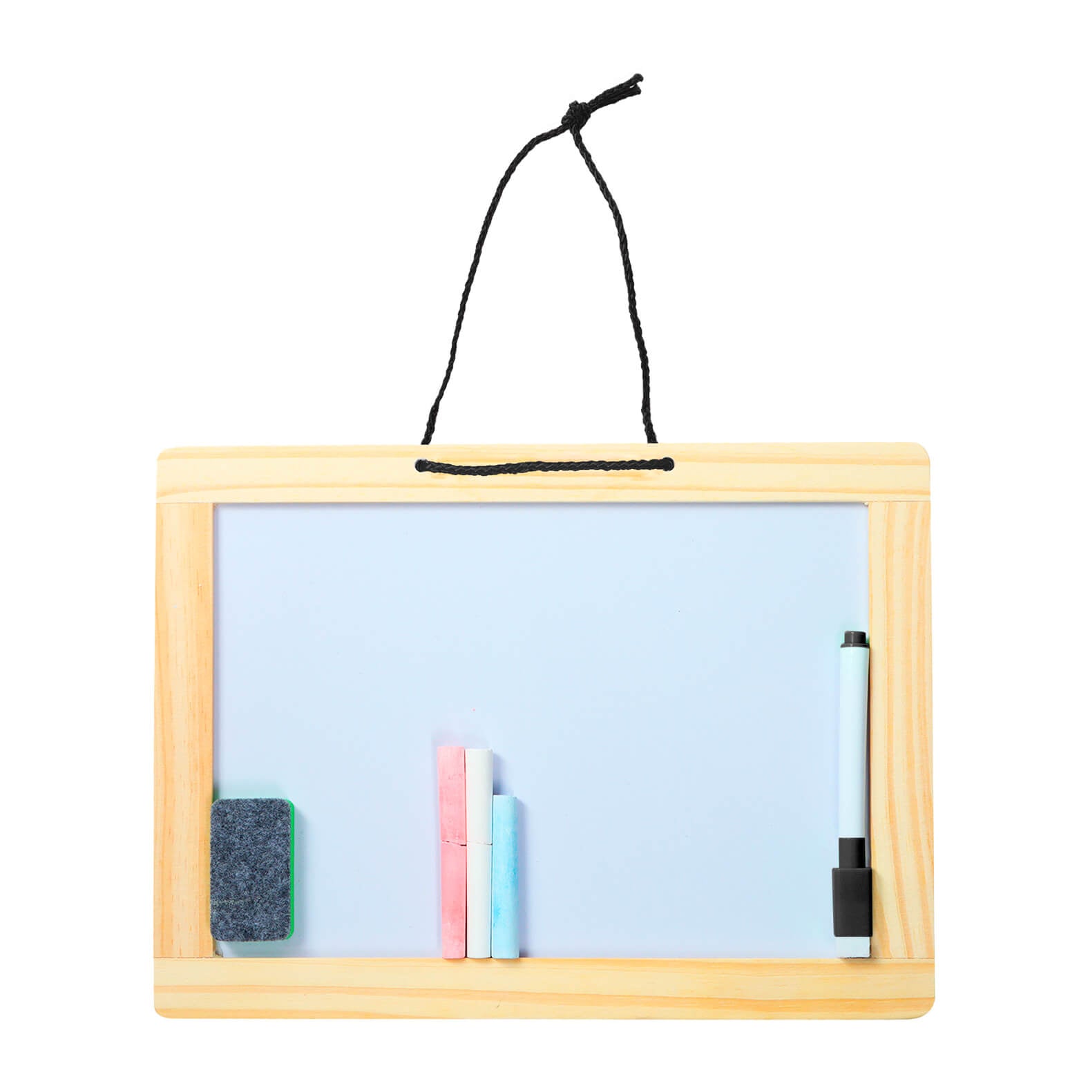 Descripción: Pizarrón de doble cara con acabado de madera que incluye mini borrador, plumón y gis.