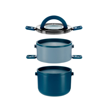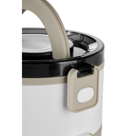 Descripción: Contenedor de alimentos con dos pisos independientes que permite separar tus alimentos y no mezclar sabores. Fabricado con una pared sencilla de plástico, ideal para el uso de microondas. Cada compartimento cuenta con su tapa hermética para evitar derrames y sus broches laterales ayudan unir o separar cada elemento. Incluye cuchara de plástico tapa con asa plegable y caja individual.