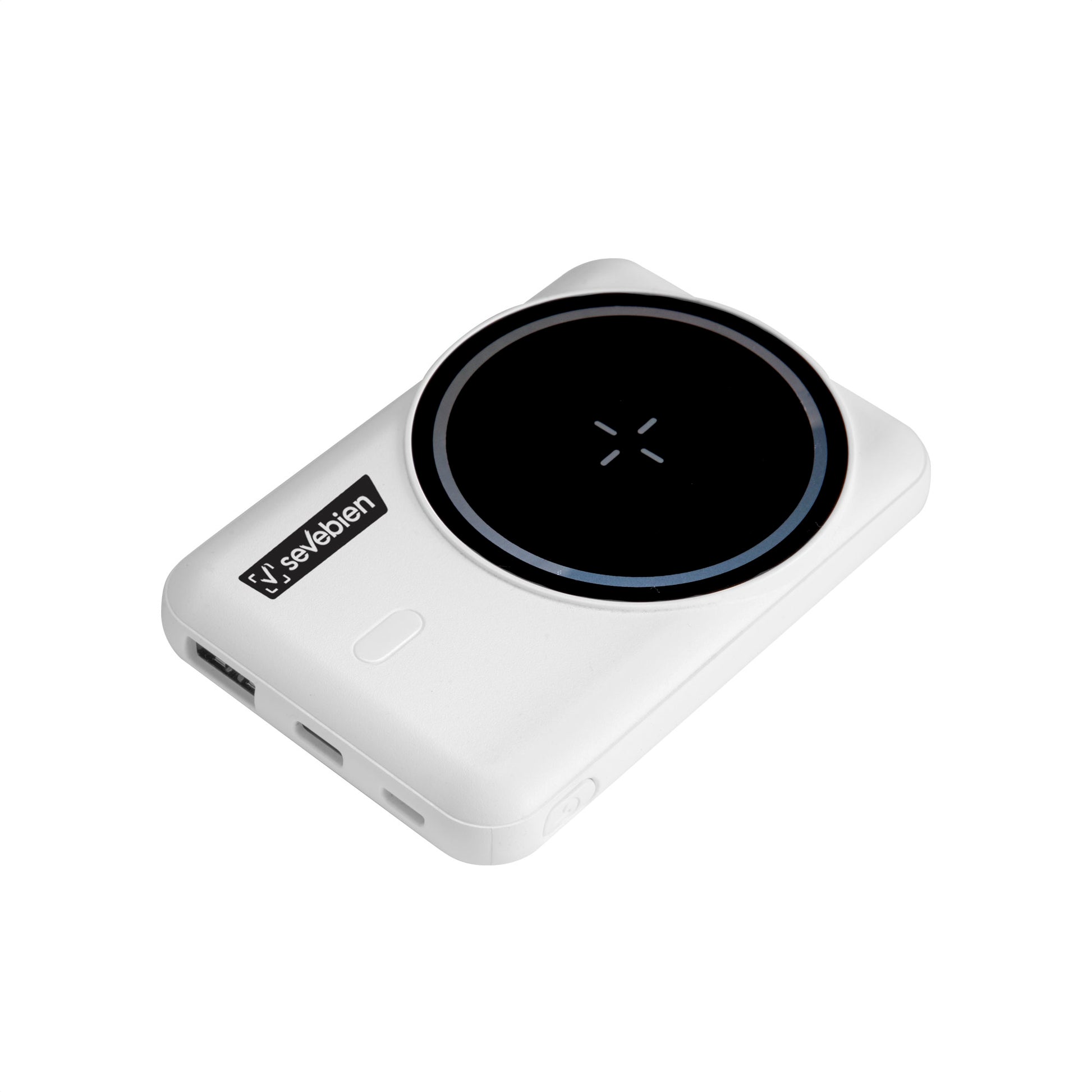 Descripción: Power bank inalámbrico con aro magnético y soporte de anillo. Color blanco mate y negro brillante. Posee Entrada y salida: 5V 2A. Con 2 puertos de carga USB-C y micro USB. Función inalámbrica magnética. Potencia inalámbrica: 5W. Indicador de luz LED de carga. Soporte plateado rebatible al dorso. Cable de carga USB-C de 30 cm. en color blanco. Presentación : en caja de regalo Kraft.
