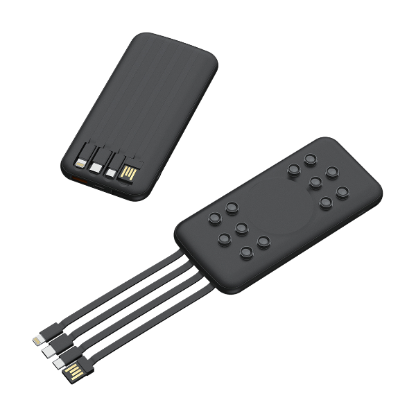 Descripción: Power Bank de 10,000 mAh, fabricado en plástico ABS, con 4 cables de carga integrados y ventosas para adherencia en la superficie del dispositivo móvil que desee cargar. Incluye caja de cartón individual.