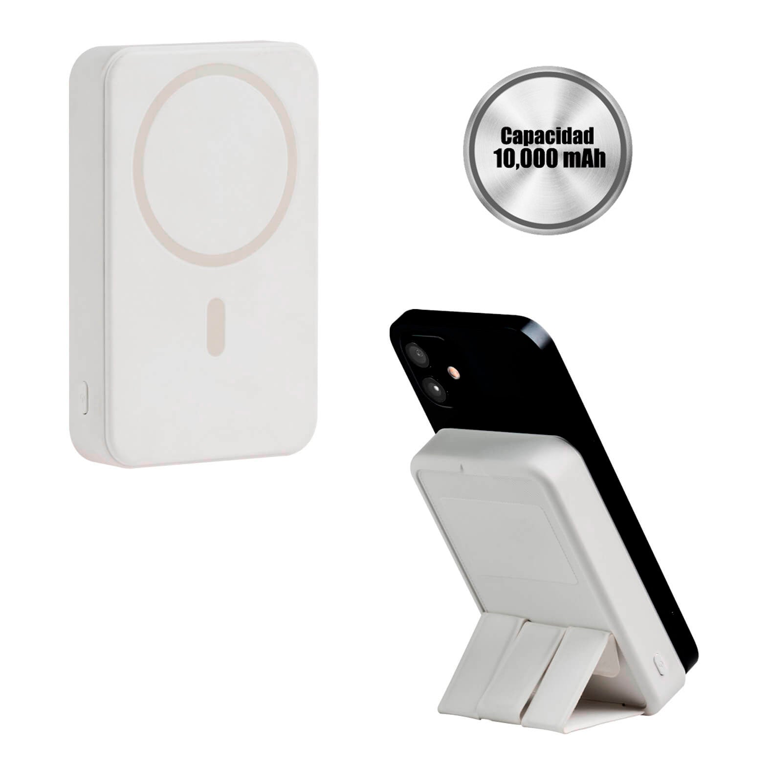 Descripción: Power Bank inalámbrico de 10,000 mAh con acabado rubber y soporte plegable. Cuenta con una entrada USB, una Micro USB, una Tipo C y una Lightning.