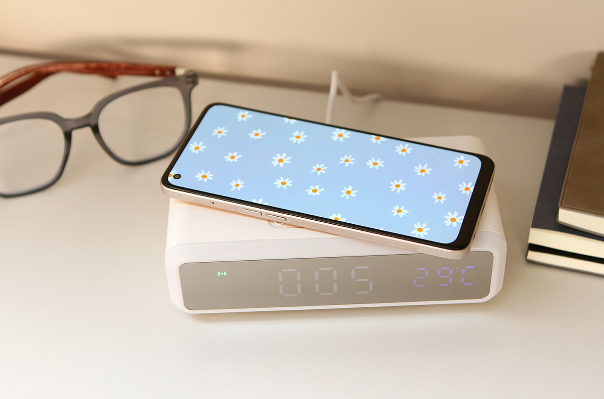 Descripción: Reloj con cargador inalámbrico, función de alarma y luz nocturna, hace de su vida más fácil gracias a su diseño clásico compacto y tamaño adecuado para colocar en su mesa de noche o buró. Potencia máxima 15W.