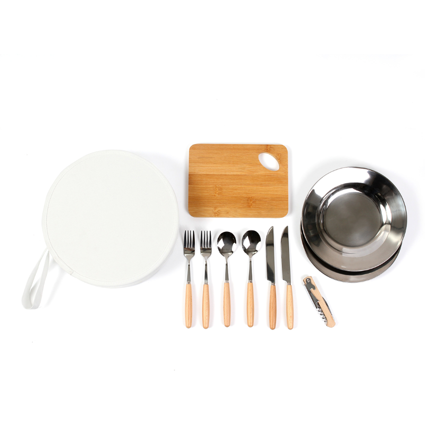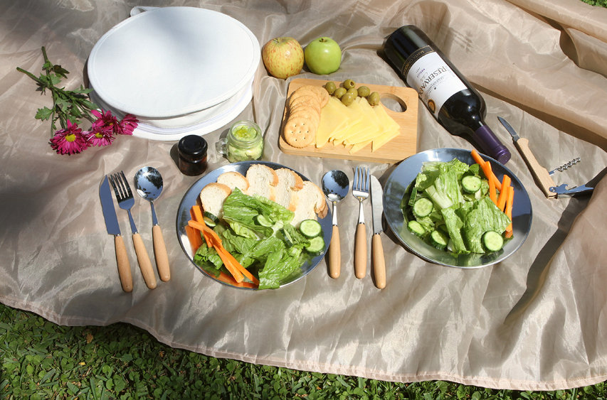 Descripción: Set de día de campo. Incluye juego de cubiertos con mango de madera, descorchador, y tabla para picar. Incluye estuche fabricado en algodón. Diseño cómodo para transportar y usar en el exterior.