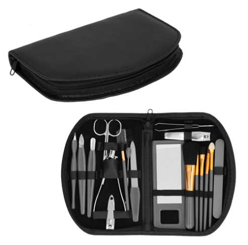 Descripción : Set de manicure en estuche de curpiel con cierre que incluye: 2 removedores de cutícula, 1 corta cutícula, cepillo para cejas, alicatas, tijeras, limpiador de oídos, 2 limas, 2 cortaúñas, depilador de cejas, espejo y 5 brochas.