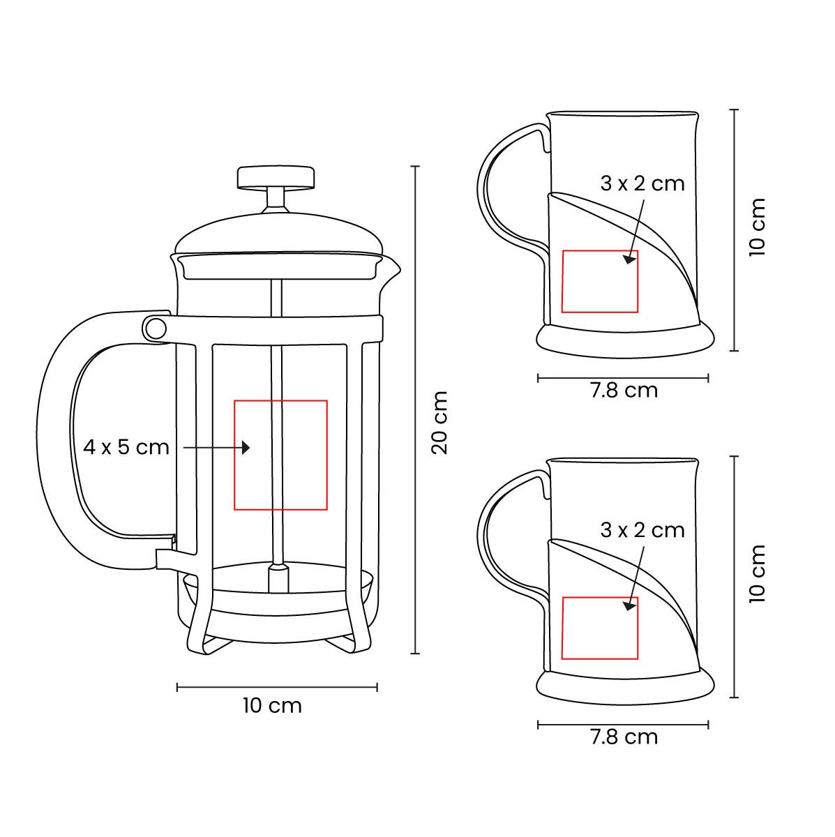 Área de impresión: 4 x 5 cm Prensa / 3 x 2 cm Tazas