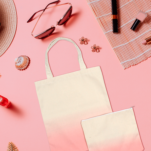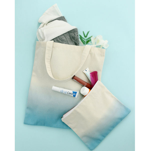 Descripción: .Set de bolsa shopper y cosmetiquera fabricadas en lona de algodón de 10 onzas, con detalles de color degradado en la base.