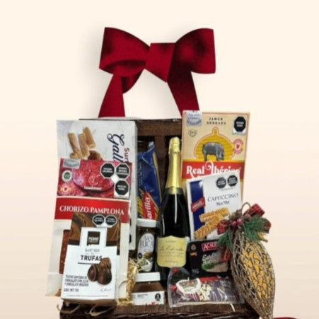 Descripción: Canasta Navideña Sabor y Elegancia en Cada Detalle Vino Espumoso Estilo Champagne 750ml Chocolate Piramide Picard 70gr Aceituna 120gr Sardinas en aceite de oliva 88 g Queso Edam Tierno Cuña Holland Kroon 225g Pasta Barilla 500 g Papas Pringles 40gr Nutella 200 g Jamon Serrano Real Ibérico 100gr Galleta Macma 330gr Galleta Macma 150 g Chorizo Serrano Pamplona 100g Baúl Vara #50 Relleno Decorativo Moño Emplayado Tarjeta Dedicatoria Armado Regalo sorpresa.
