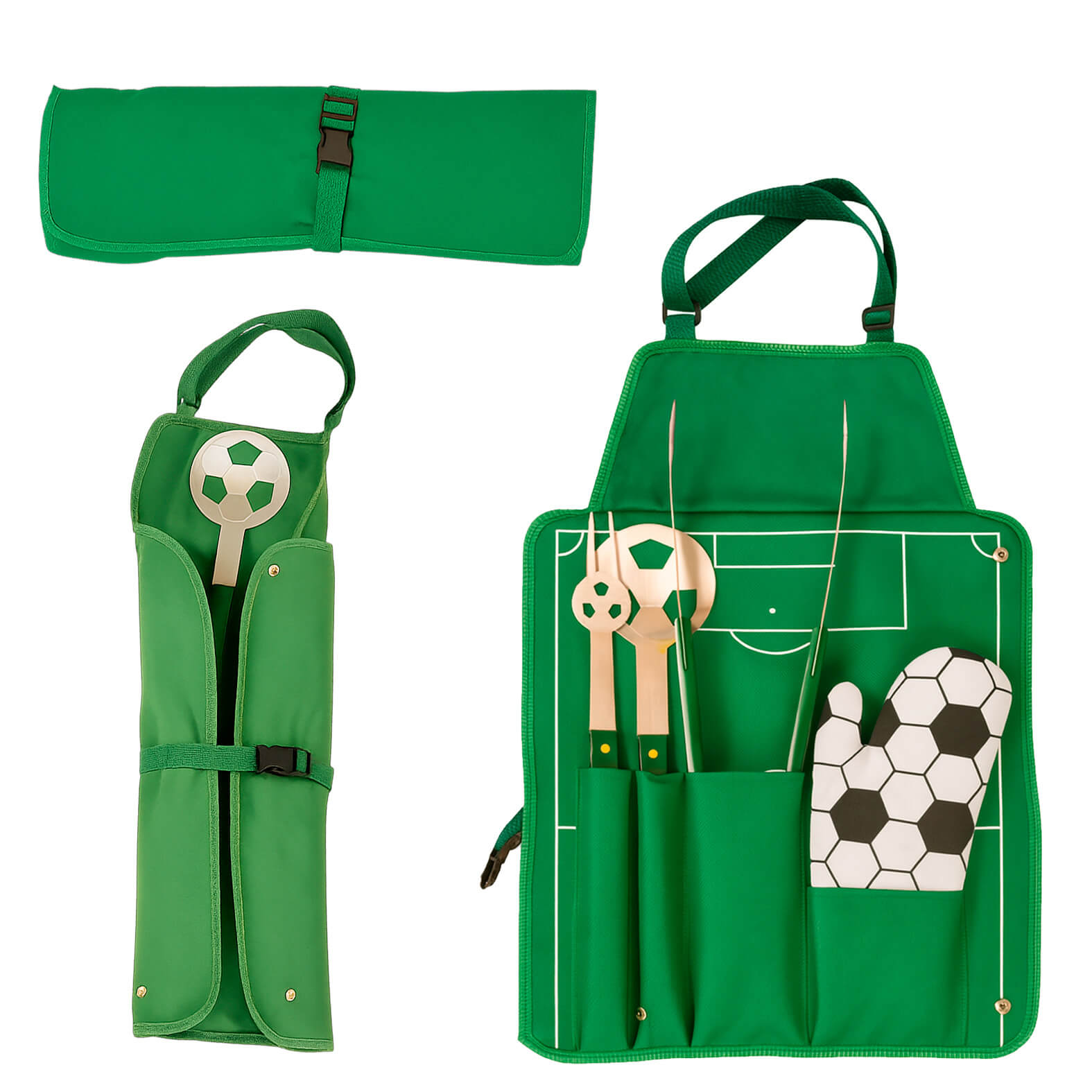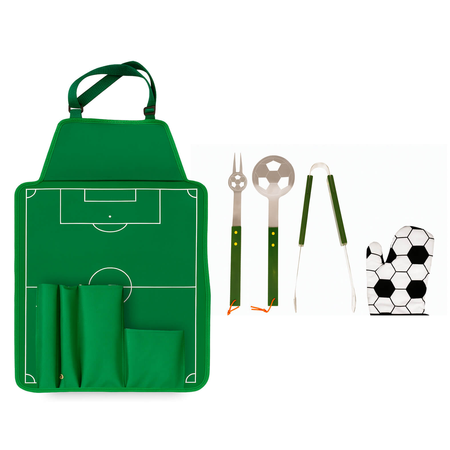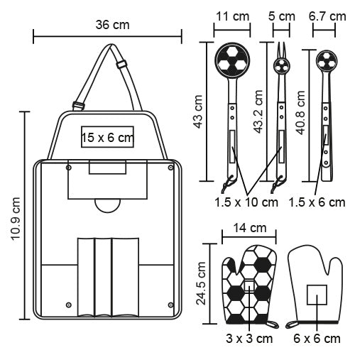 Descripción: Set de BBQ en estuche con diseño de cancha de fútbol que también funciona como mandil. Incluye guante, pinzas, tenedor asador y volteador.