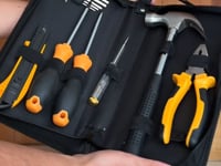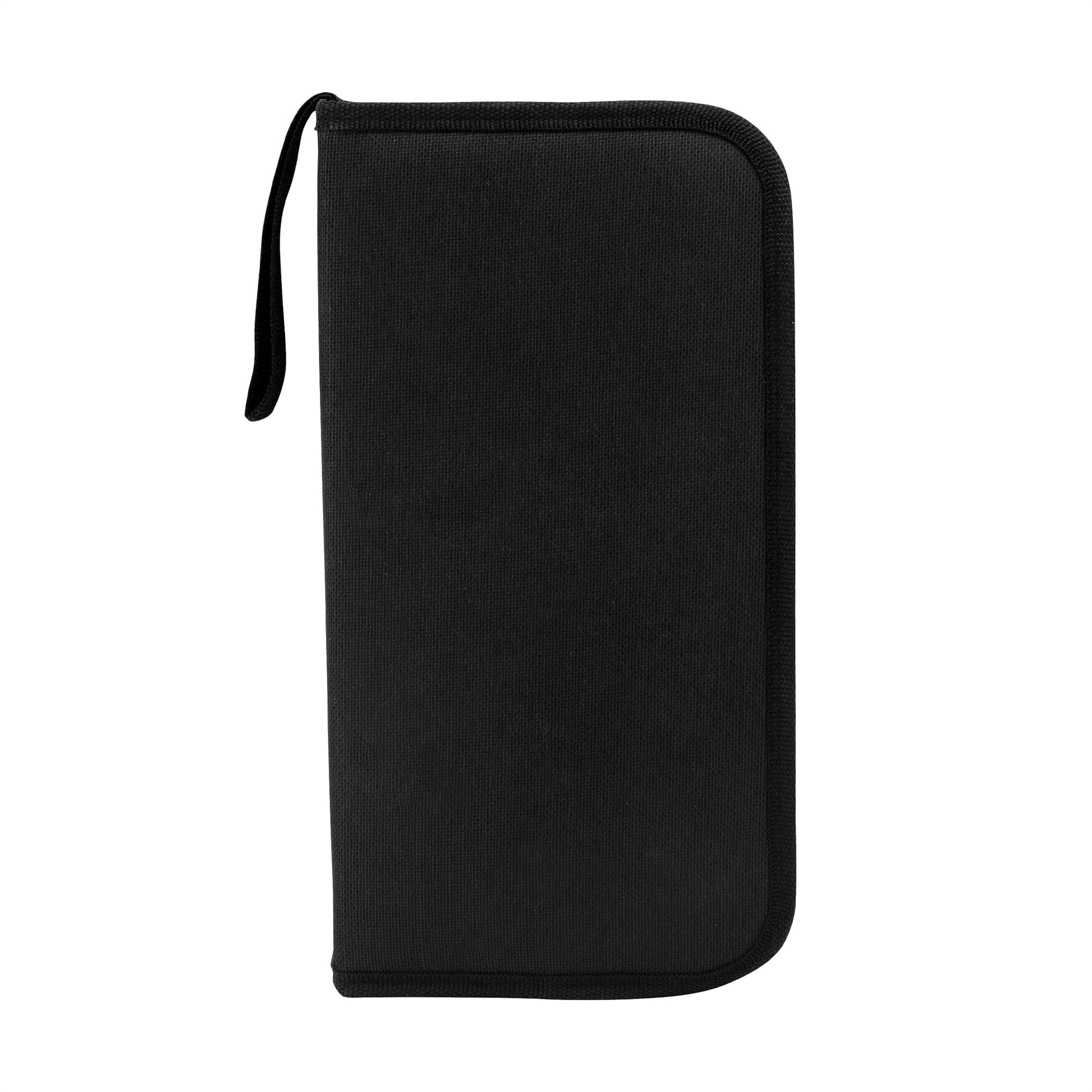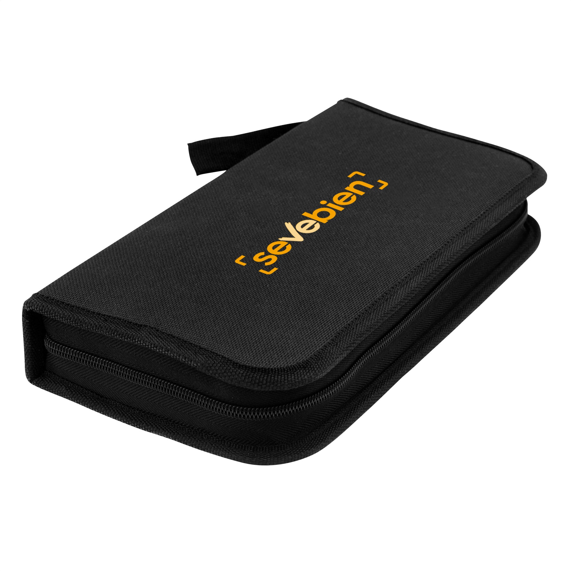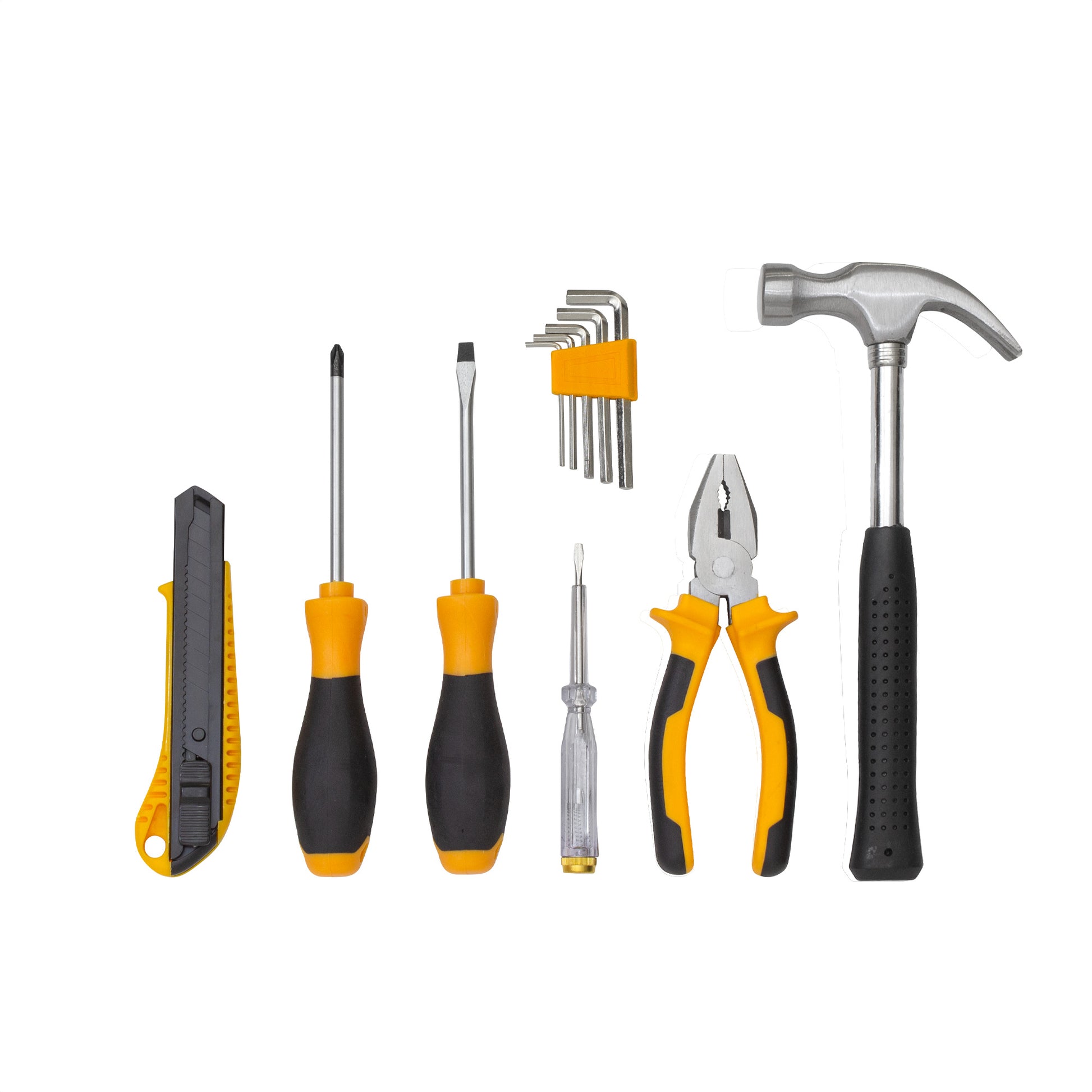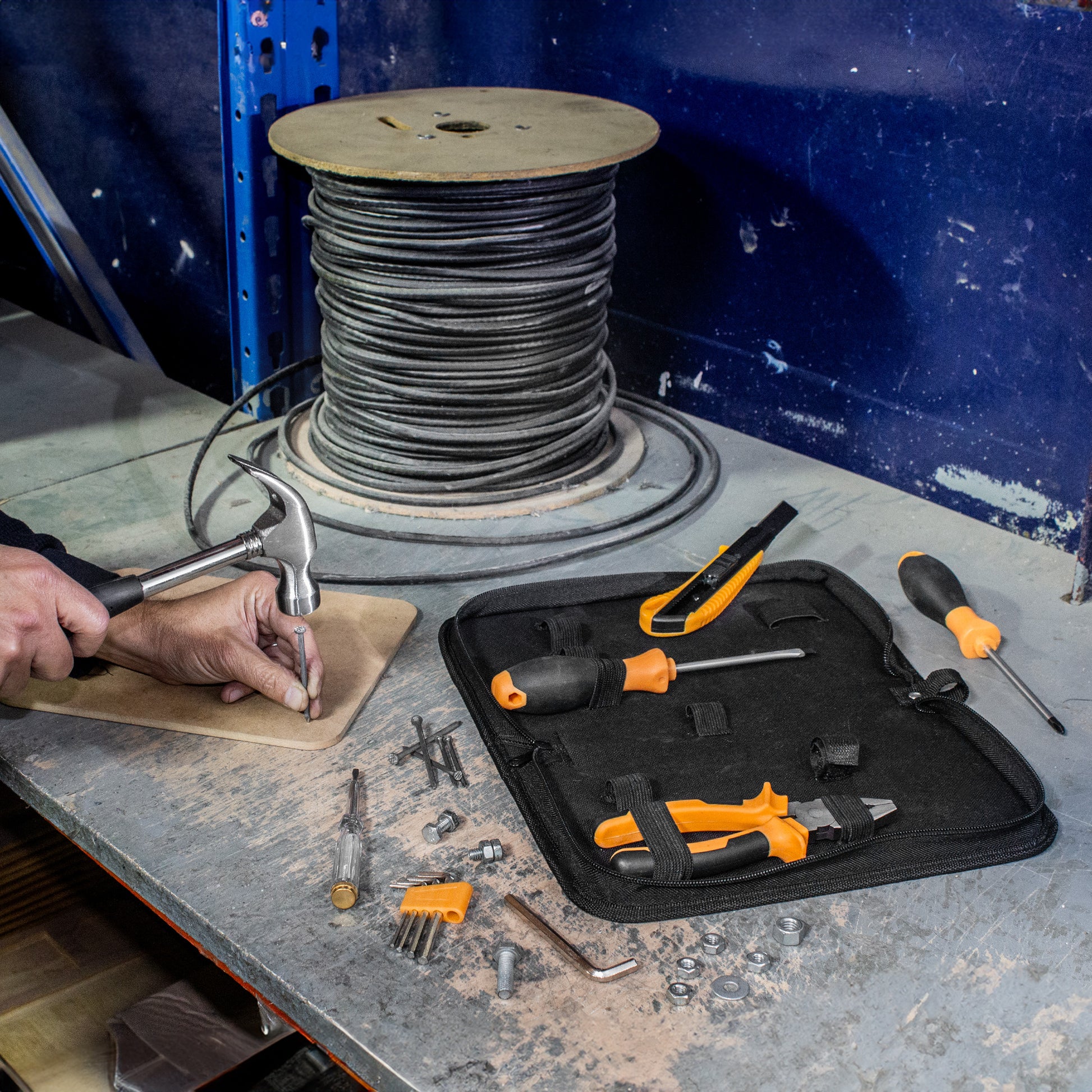 Descripción: Set de herramientas. Contiene 12 piezas: 1 juego de 5 llaves Allen hexagonales (2, 3, 4, 5 y 6 mm.), Cutter profesional 18mm. con seguro, 2 destornilladores con diferentes puntas de 5mm (plana y phillips), 1 destornillador tester buscapolo (100-500V), martillo de uña 23 mm. y 1 pinza alicate universal 165 mm. Todas las piezas están sujetadas con elastico en estuche portable de poliéster 600D. Presentación Estuche con cierre y caja de regalo kraft.