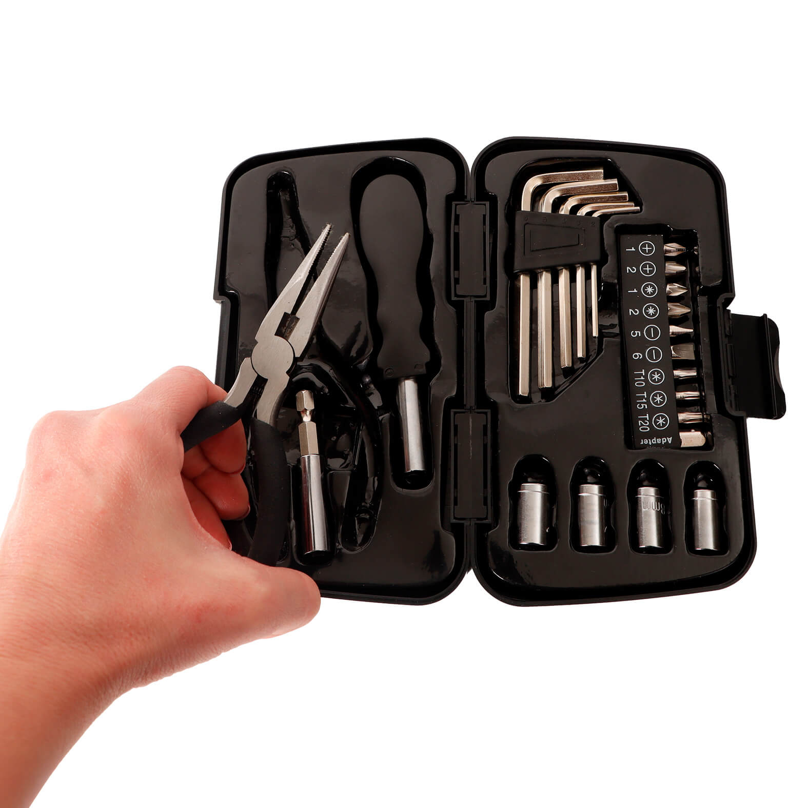 Descripción: Set de herramientas en estuche de plástico que incluye: pinzas, desarmador, extensible, 4 dados, 1 juego de llaves Allen y 1 juego con 10 puntas.