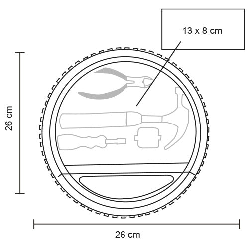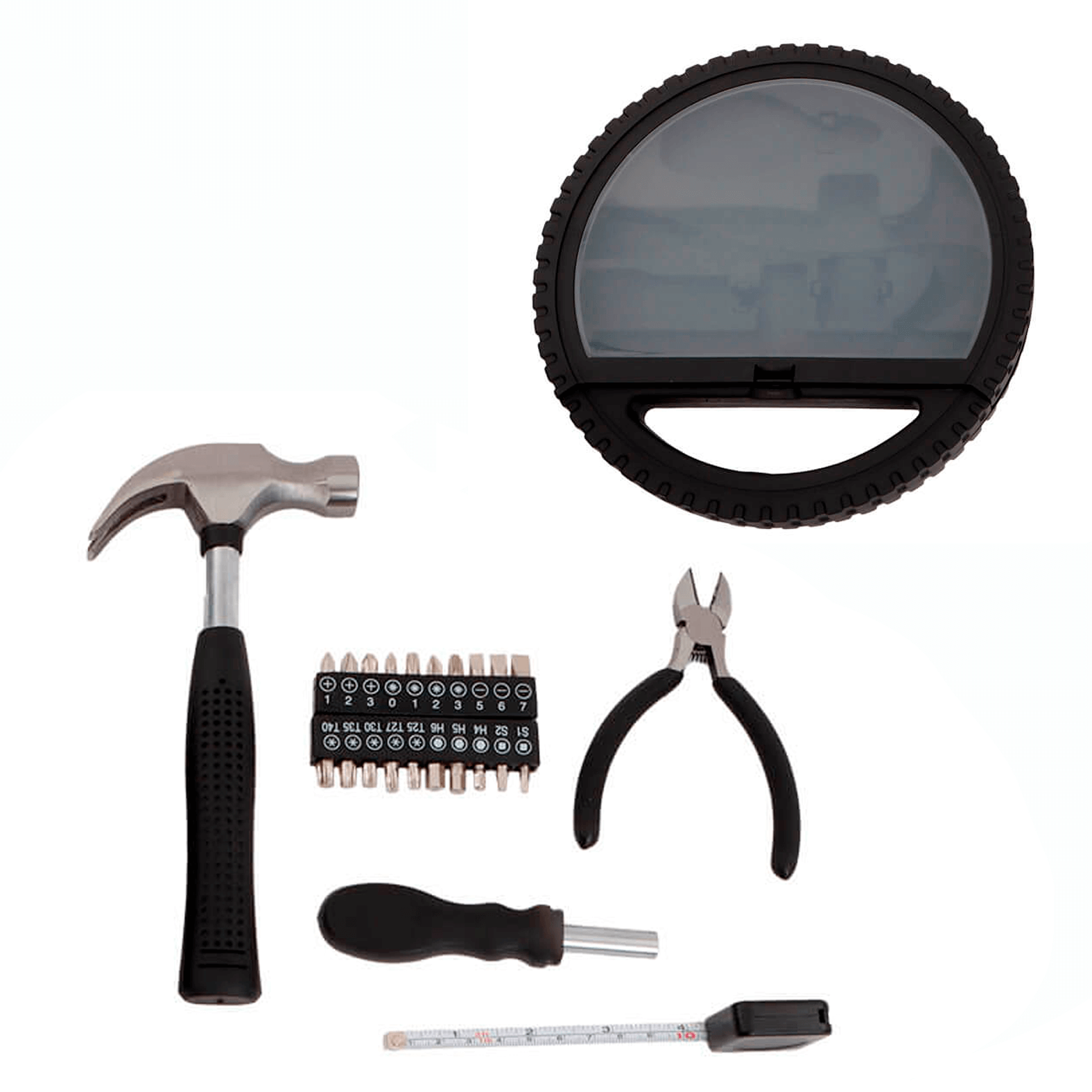 Descripción: Set de herramientas en forma de llanta que incluye: 1 martillo, 1 pinza, 1 flexómetro, 1 destornillador y 2 juegos de 10 puntas.