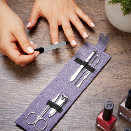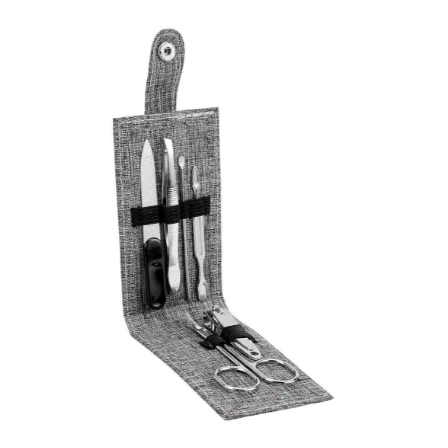 Descripción: Incluye 1 tijeras, 1 pinza para cejas, 1 corta uñas, 1 lima de uñas, 1 empujador de cutícula y 1 limpia uñas.