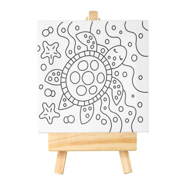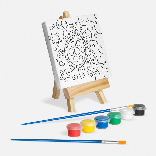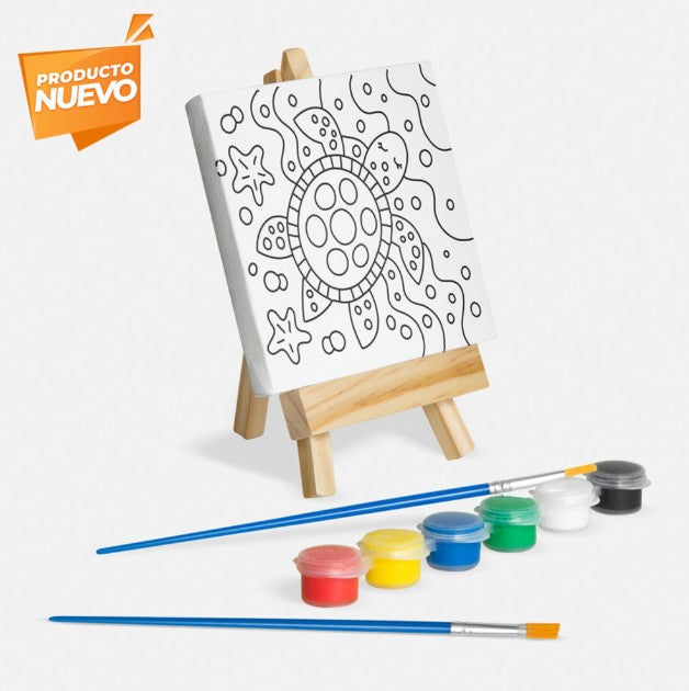 Descripción: Set de pintura con lienzo que incluye un dibujo prediseñado, listo para que los niños lo pinten y le den vida con su creatividad. También cuenta con un caballete de madera, dos pinceles y una paleta de pinturas con 6 colores diferentes. Ideal para introducir a los niños al mundo del arte de manera simple y entretenida.