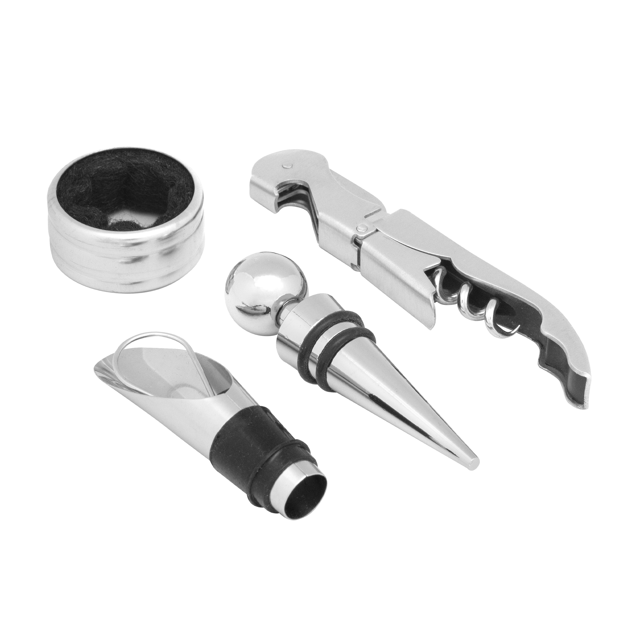 Descripción : Set de vino de 4 piezas (sacacorchos, anillo antigoteo, tapón y vertedor) con juego de ajedrez. Caja contenedora en bambú con piezas de ajedrez en madera. Abridor de acero inoxidable 420. Anillo de acero inoxidable 210. Tapón con aleación de zinc y aluminio. Vertedor de acero inoxidable 201 + silicona. Presentación en caja de regalo kraft.