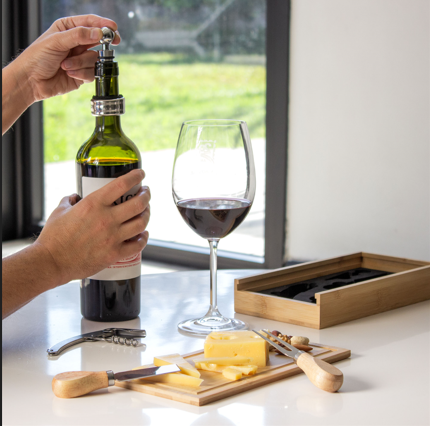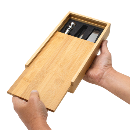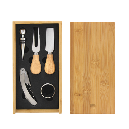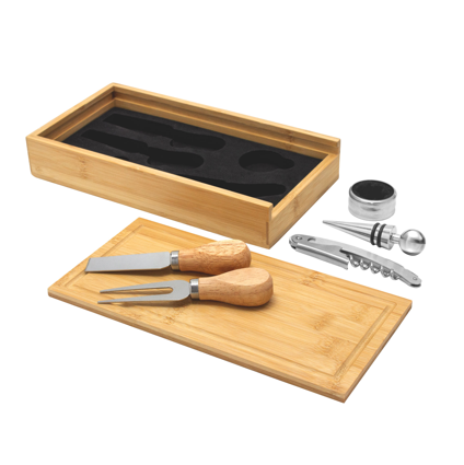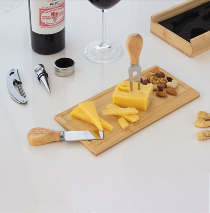 Descripción: Set de accesorios para vino y corte de quesos. Caja con tapa deslizable de bambú. Tapa / tabla de corte de 24 x 12 x 0,8 cm. Contiene 5 piezas: Destapador sacacorchos (acero inoxidable 420, 11 cm. y 50 g.); Cuchillo y tenedor de queso (acero inoxidable 420 con mango de madera de caucho, 12,8 cm. y 25 g. c/u) Anillo de vino (acero inoxidable 430 y non woven, Ø 3,9 cm.) ; y Tapón de vino (aleación de zinc, 56 g.). Presentación en caja de regalo kraft.