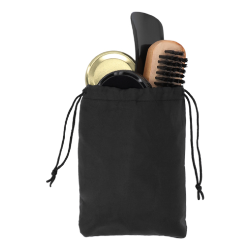 Descripción : Set de boleado para calzado con estuche de poliéster y correa ajustable que incluye: calzador, cepillo de madera, paño, lustrador con esponja y grasa en crema color negro.