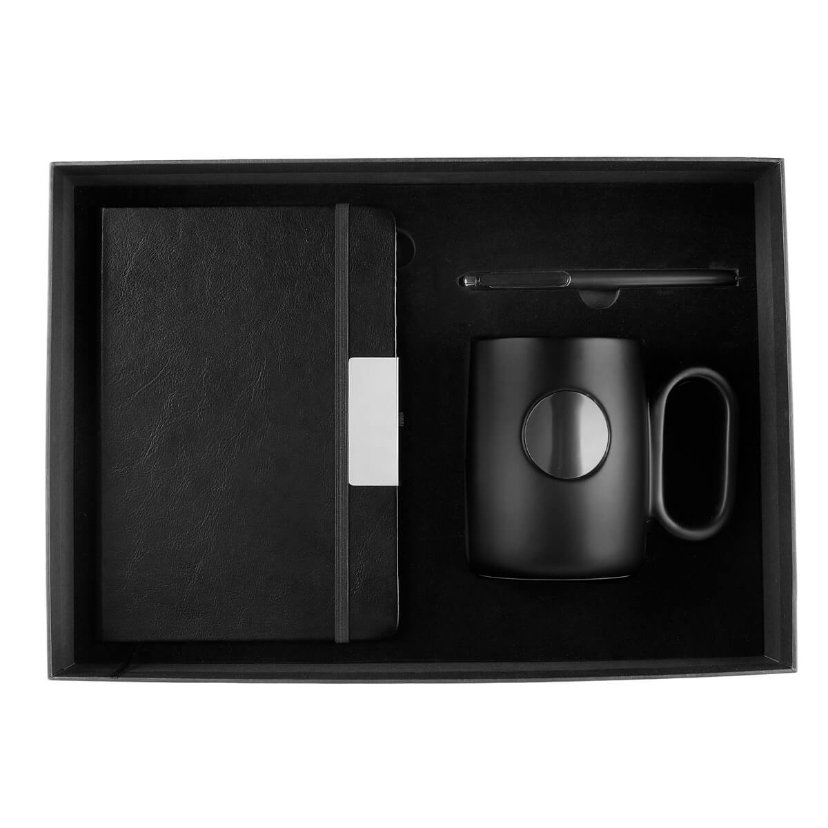 Descripción: Set de regalo ejecutivo de 3 piezas. Contiene libreta de pasta dura con 80 hojas recicladas a raya y placa metálica. Incluye listón separador y elástico porta bolígrafo. Bolígrafo de plástico con mecanismo pulsador y taza de carámica con placa metálica circular. Capacidad de 473 ml. Incluye caja de regalo rígida.