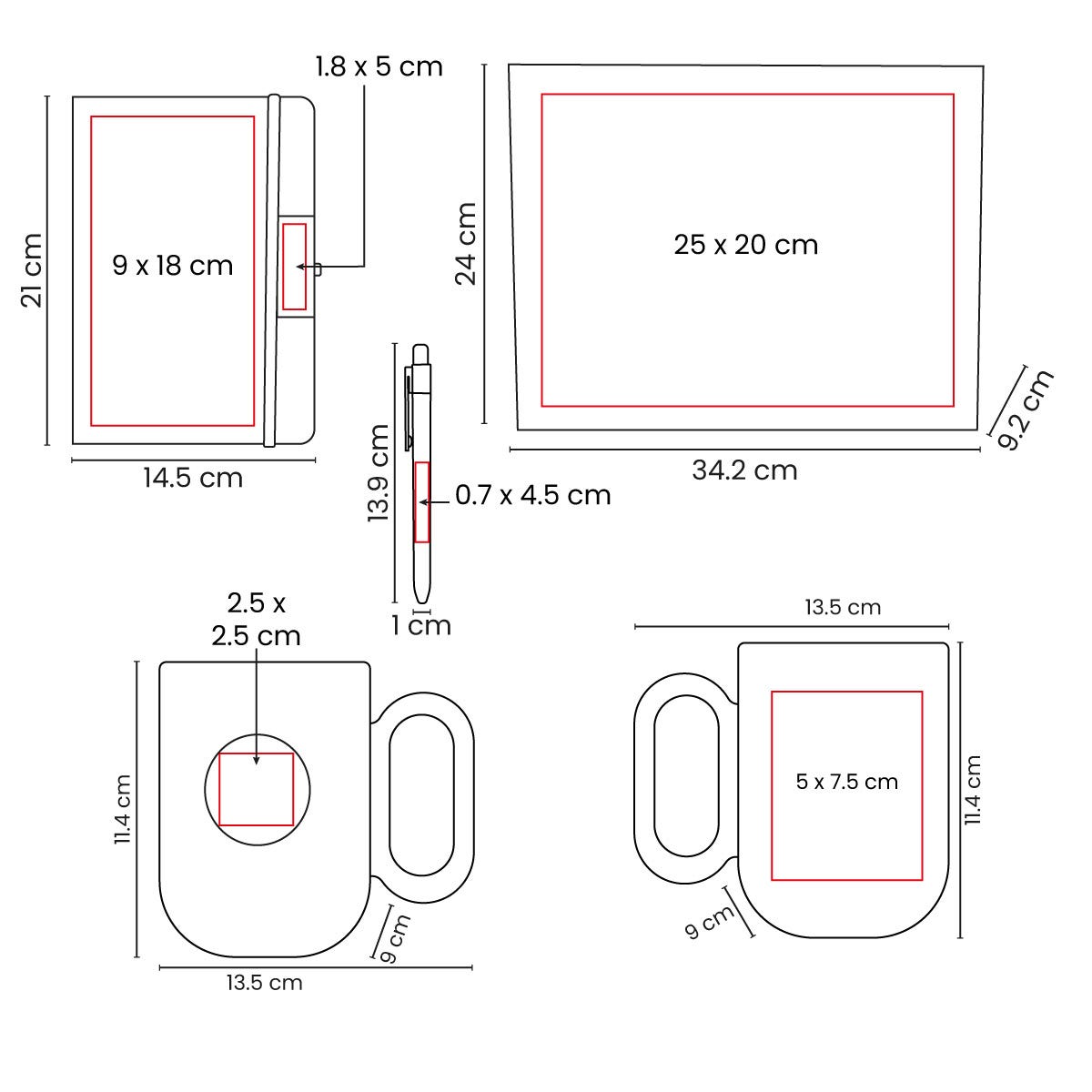 Área de impresión: 25 x 20 cm Caja / 9 x 18 cm Libreta Pasta / 1.8 x 5 cm Libreta Placa / 0.7 x 4.5 cm Bolígrafo / 2.5 x 2.5 cm Taza Placa / 5 x 7.5 cm Taza Cuerpo