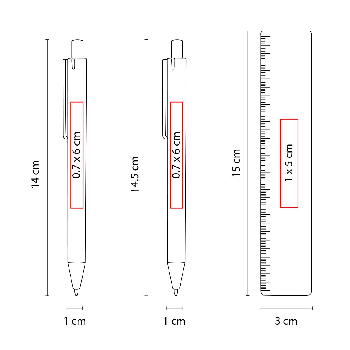 Medidas: 1 x 14 cm bolígrafo / 1 x 14.5 cm lapicera / 3 x 15 cm regla / 3 x 2 cm borrador
