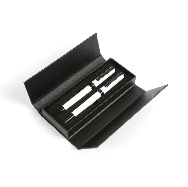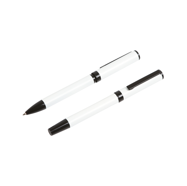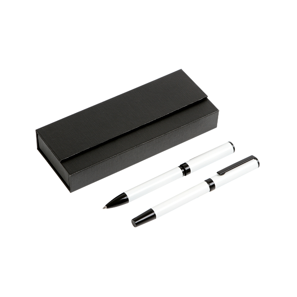 Descripción : Set ejecutivo de dos bolígrafos metálicos color blanco con detalle en negro, incluye caja de regalo. Un bolígrafo con mecanismo retráctil y otro con mecanismo twist.