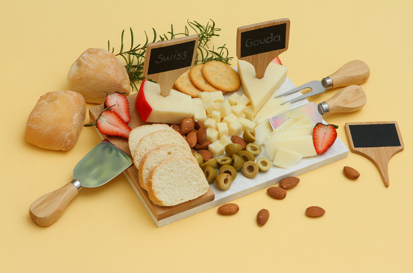 Descripción: Set de quesos fabricado en mármol y madera de bambú. Incluye 3 marcadores y 3 cuchillos de acero inoxidable, especiales para quesos. Su diseño en mármol le otorga un perfil elegante, que lo hace la opción indicada para reuniones.