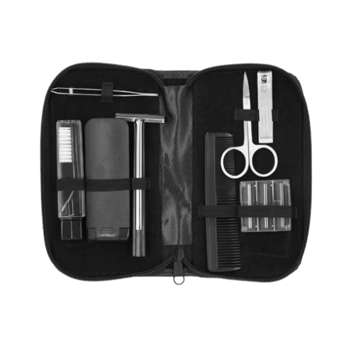 Descripción : Set de higiene personal de curpiel con cierre que incluye: rastrillo con 3 hojas intercambiables, quita pelusas, cepillo dental portátil, pinzas para depilar, tijeras, cortaúñas y peine.