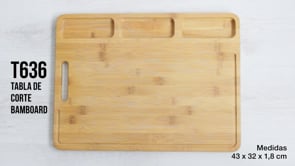 Descripción: Tabla de corte en Bambú. Tres compartimentos para armar botanas y llevarlas directo a la mesa. Transportable con manija incluida. Presentación en caja de regalo.