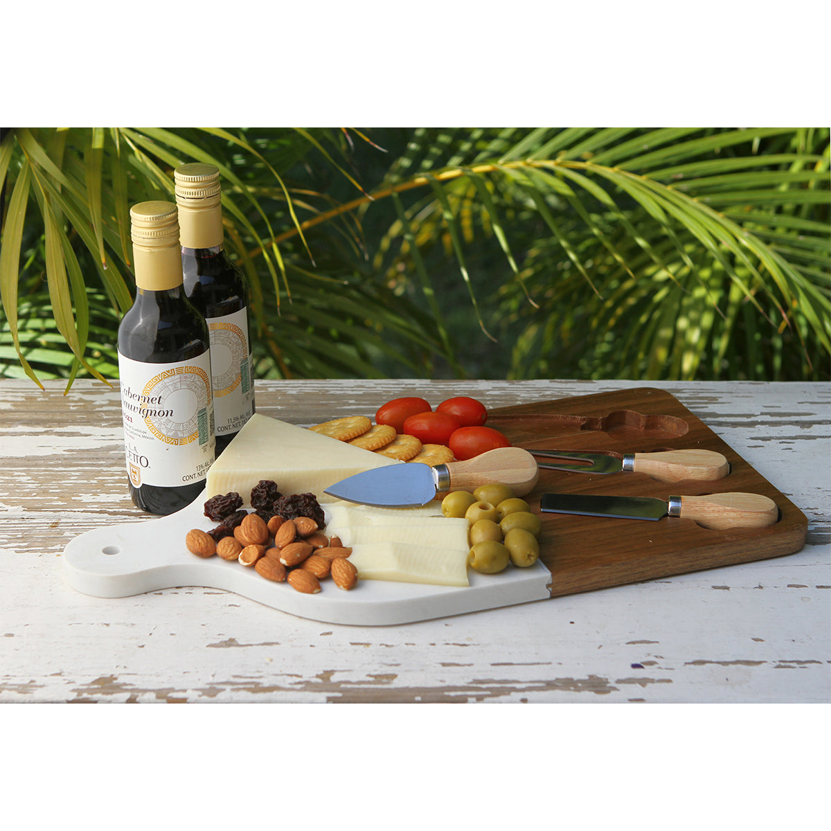 Descripción: Tabla de quesos fabricada en madera de acacia con recubrimiento de laca mate y mármol. Cuenta con tres suajes de cuchillo, espátula y trinche para quesos con mango de madera de acacia y acero inoxidable. Diseñada para servir quesos, botanas o aperitivos con un estilo elegante y moderno.