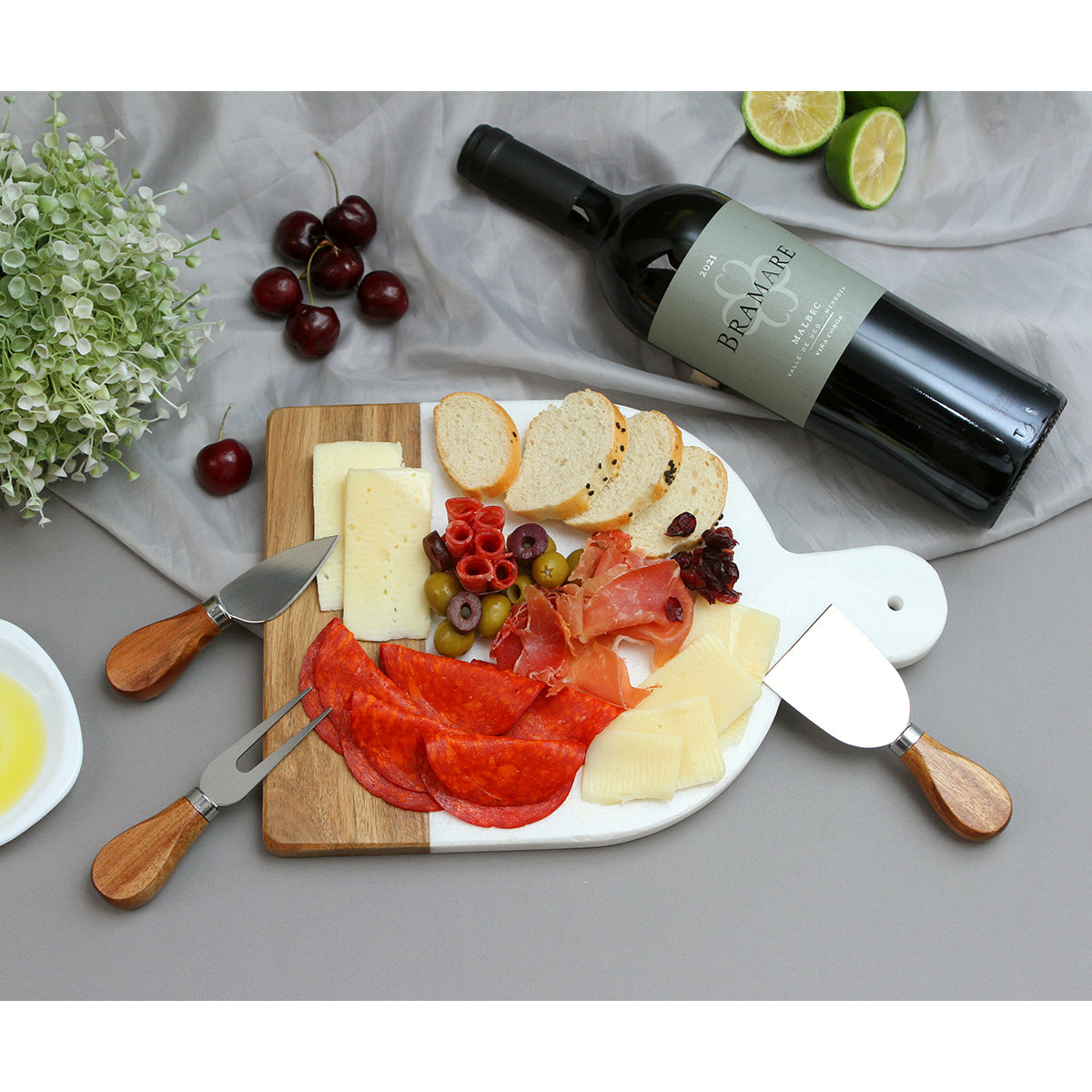 Descripción: Tabla para quesos fabricada en mármol blanco y madera de acacia con acabado en laca para una mayor resistencia, incluye 1 cuchillo, 1 trinche y 1 espátula, fabricada en madera de acacia y acero inoxidable.
