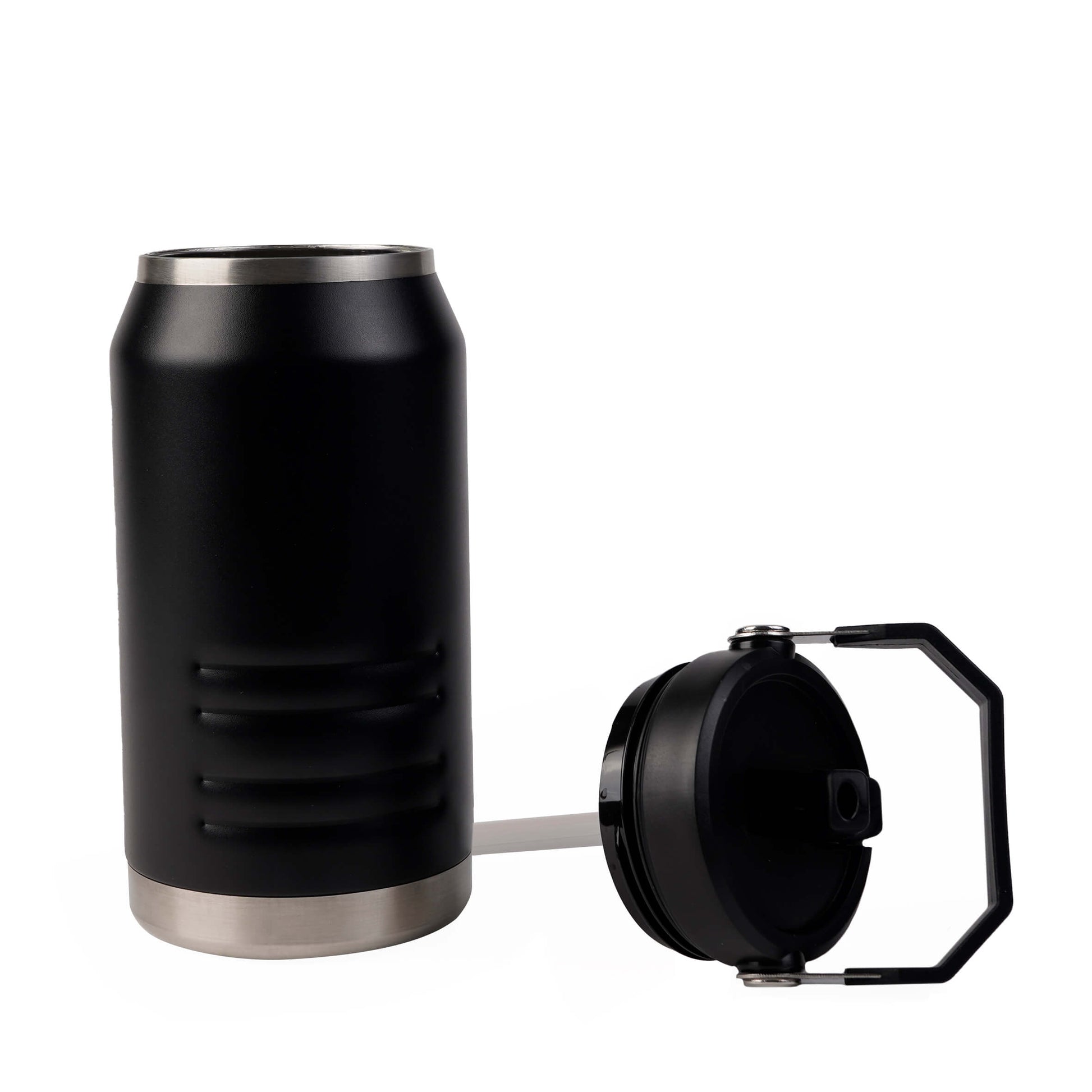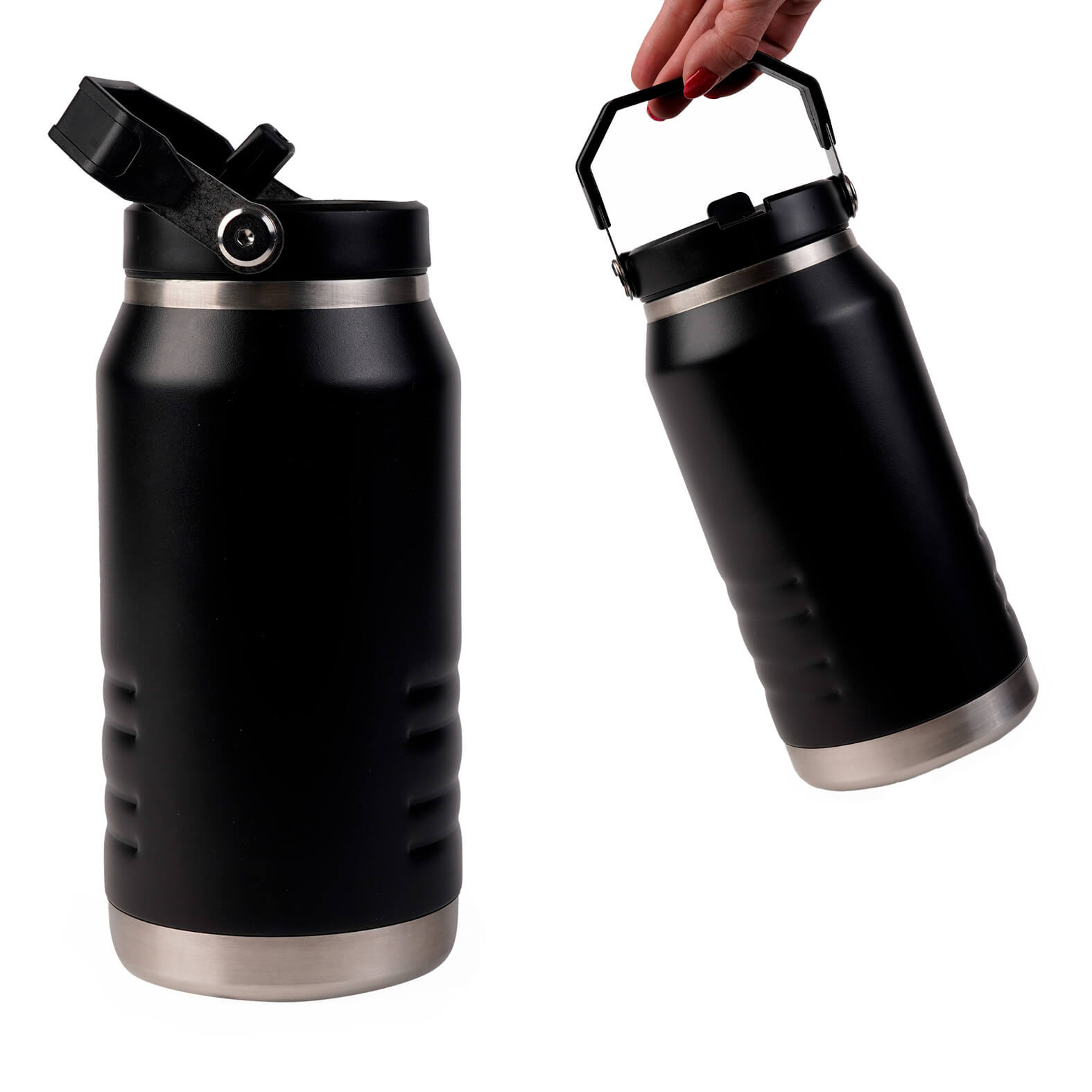 Descripción: Termo con doble pared de acero inoxidable, insulado al vacío, con acabado rugoso y tapa enroscable que cuenta con boquilla abatible, popote y asa en la parte superior.