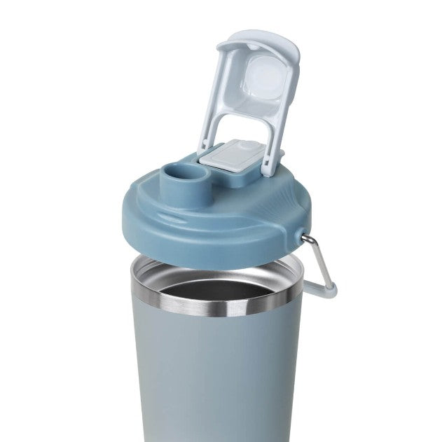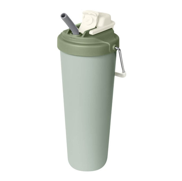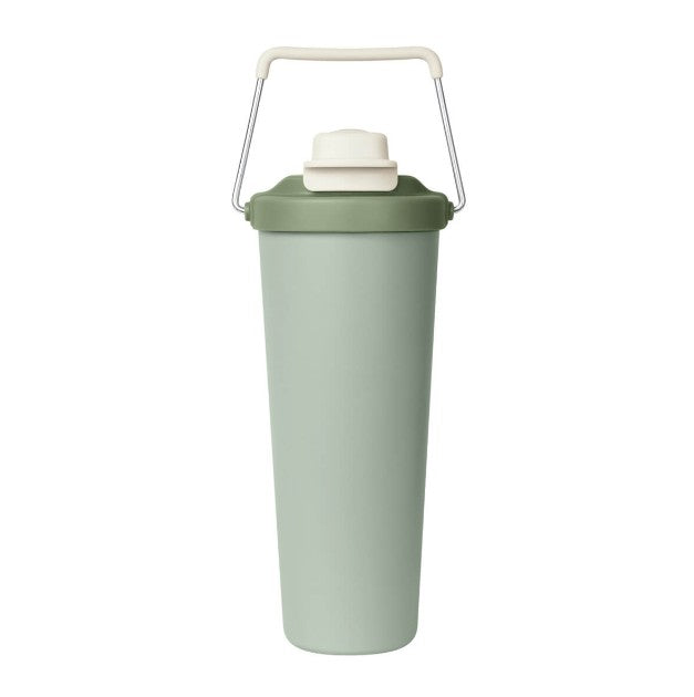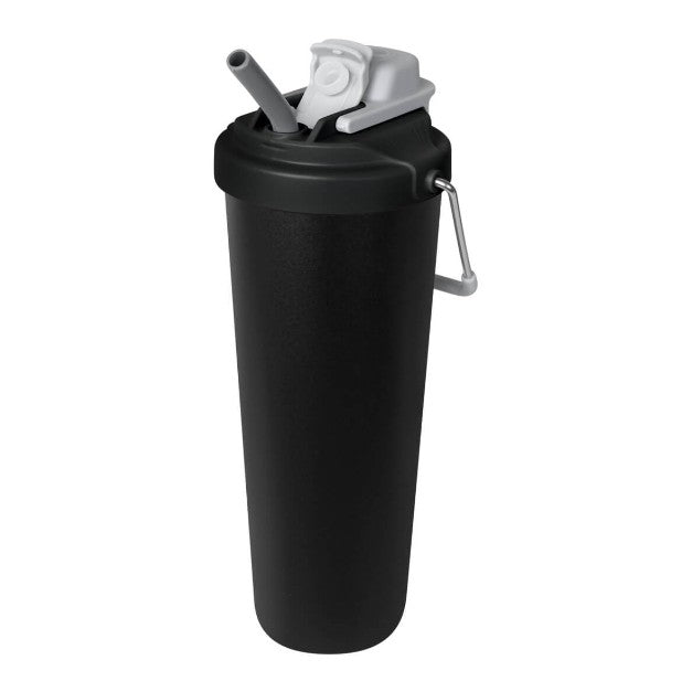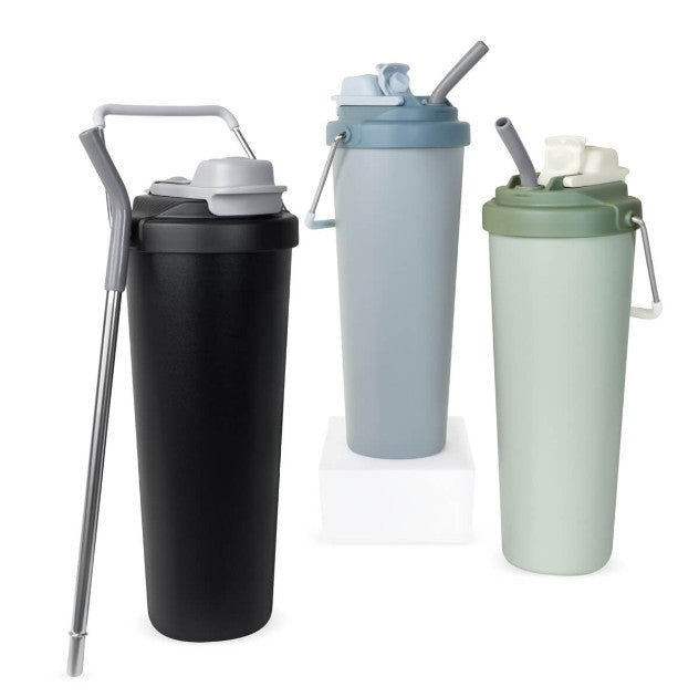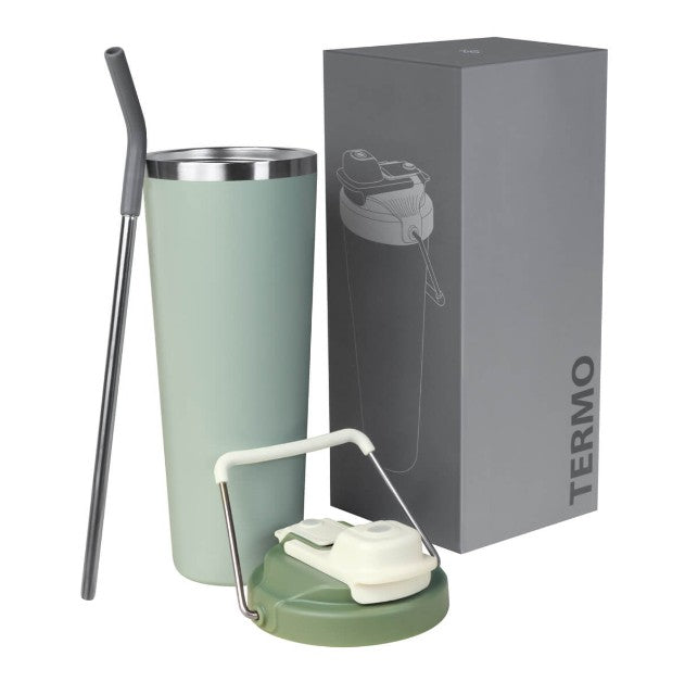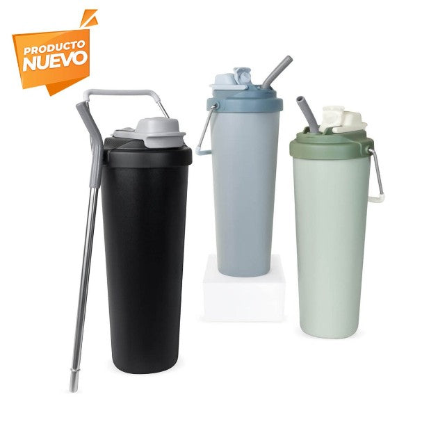 Descripción: Termo doble pared. Cerrado al vacío. Pared interna y externa acero inoxidable. Cuerpo con terminado rugoso. Tapa de plástico con sistema de rosca y doble sobretapa con cierre push, una con boquilla para beber y otra con ranura para popote. Agrega un asa metálica con recubrimiento de silicón para llevarlo contigo a todos lados. Mantiene la temperatura caliente por 4 hrs y la temperatura fría por 8 hrs. Capacidad de 25 Oz. Base de 7 cm de diámetro. Incluye caja individual.