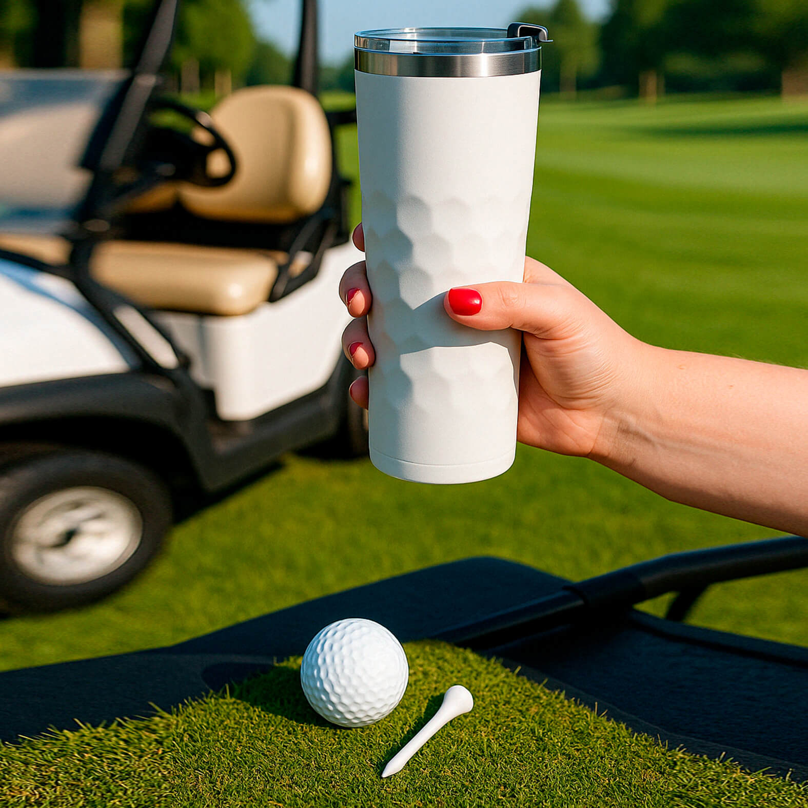 Descripción: Termo con doble pared de acero inoxidable, insulado al vacío, acabado rugoso y textura que simula una pelota de golf.