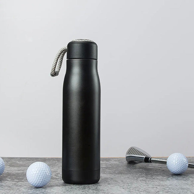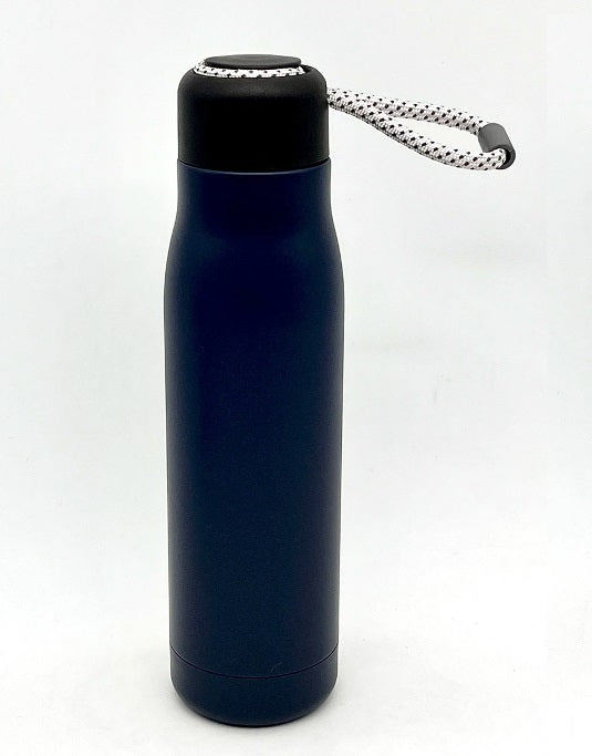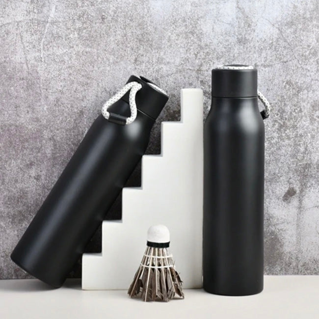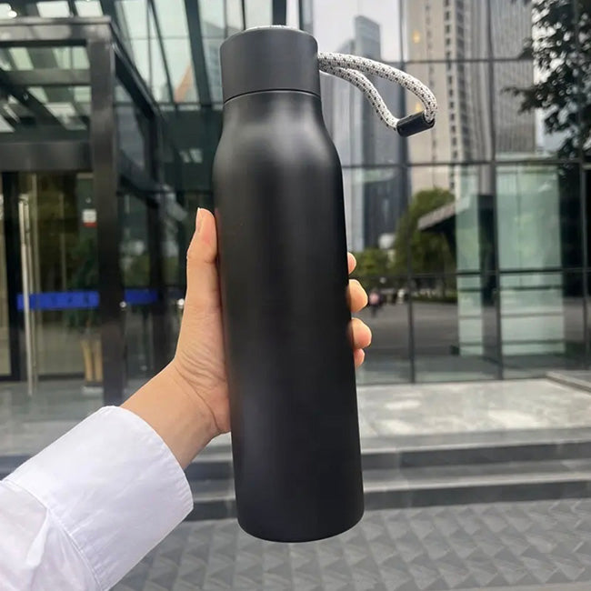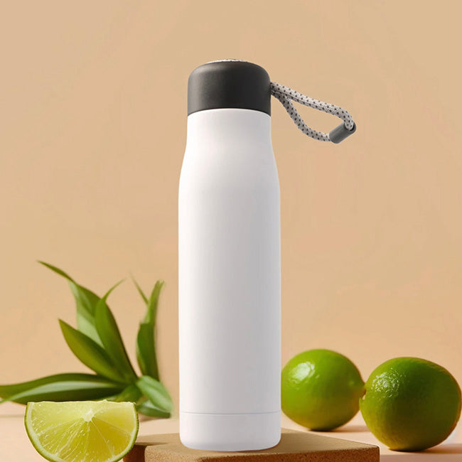 Descripción: Termo Salix • Capacidad: 600 ml • Tecnología de doble pared al vacío para conservar la temperatura por más tiempo. • Tapa de rosca con cierre hermético. • Correa trenzada integrada en la tapa para fácil transporte. • Colores: (no especificado en ficha, usualmente metálico)