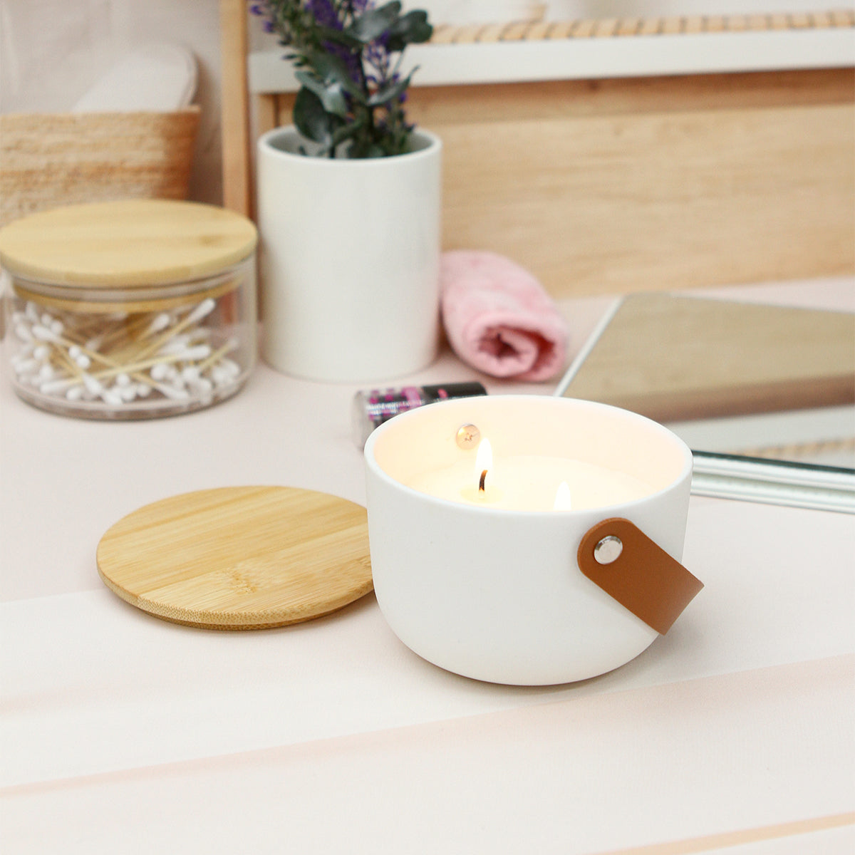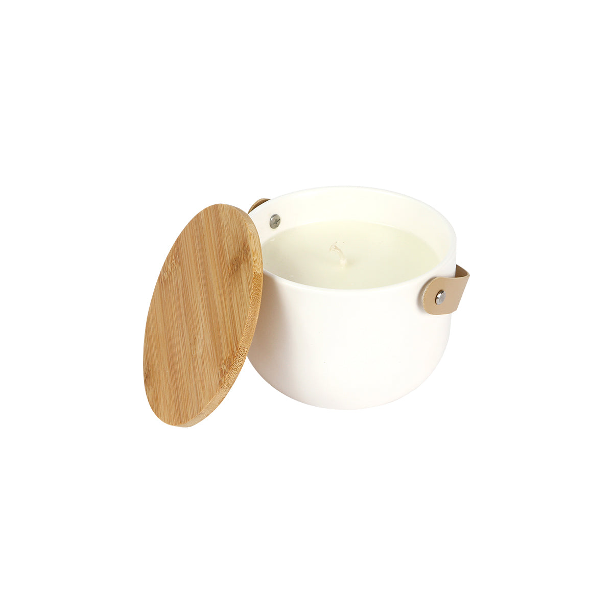 Descripción: Vela fabricada con cera de soja con esencia de limón y con contenedor de cerámica, su tapa de bambú le agrega un delicado detalle en madera que contrasta con el color blanco de la cerámica. Incluye una agarradera fabricada de curpiel. Su diseño sofisticado hace que sea ideal tanto para el uso en hogares como en ambientes profesionales como, oficinas o boutiques. Incluye caja de cartón individual.